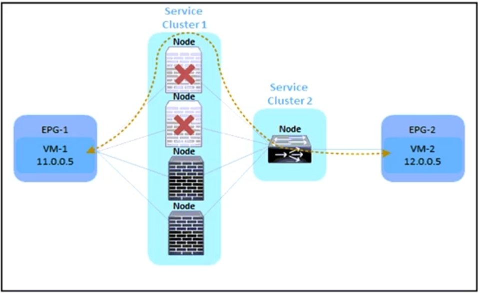 Refer to the exhibit. An engineer must divert the traffic between VM-1 and VM-2 by using a Multi-Node service graph. The solution should prevent an insufficient number of available Layer 4 to Layer 7 devices in the first cluster. Which configuration set accomplishes this goal?