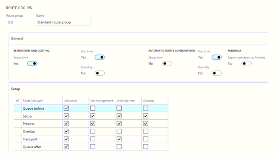 You must direct postings of route cards based upon the route groups at Report as finished. You set the start default order setting for route posting to Never and the Report as finished setting to Route Group Dependent.