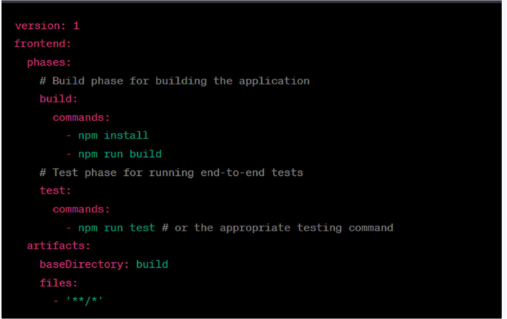 In this setup, the test phase is added after the build phase. The commands under the test phase should be configured to run your end-to-end tests. You would replace npm run test with the actual command you use to run your tests.