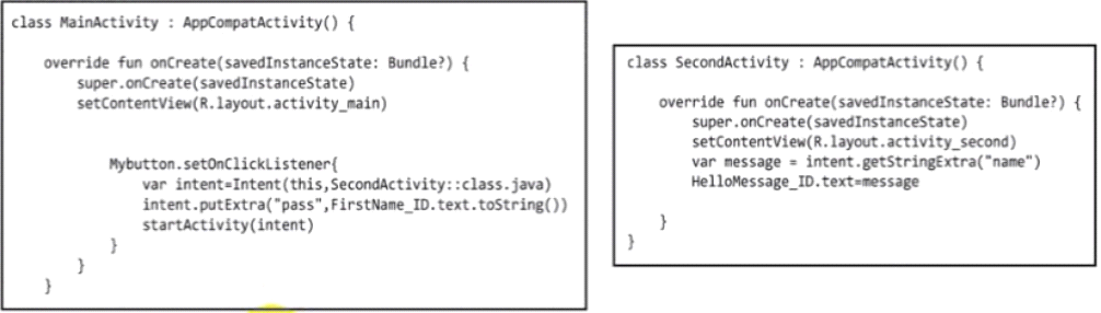 You have an Android application that consists of two activities (MainActivity and SecondActivity) and you want to pass data in text field (ID: FirstNameJD) of MainAcitivity to SecondActivity. The passed data will appear in SecondActivity inside a TextView widget with Id: HelloMessageJD. You will use Intent to pass this data from MainActivity to SecondActivity. The Following two images include the Android code which will be written in MainActivity.kt and SecondActivity.kt files. Your data will not pass from MainActivity to SecondActivity due to a mistake in the code in SecodActivity.kt. Which of the following choices is a correct solution to make this app run correctly?