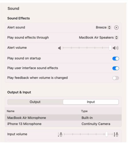 You're trying to connect a podcasting microphone to your MacBook Air. You're using the Apple USB-C Digital AV Multiport Adapter connected to a standard USB A to B cable that connects to the microphone. You open Sound in System Settings and click the input tab. but the microphone doesn't appear in the sound input device list.