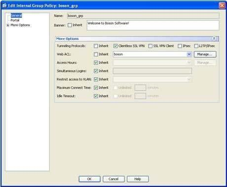 You can view the details of the boson_grp group policy to determine whether a banner message will be displayed to VPN clients. This information is displayed on the Generalpane of the Add or Edit Internal Group Policy dialog box. To view the details of an existing group policy for clientless SSL VPN users in ASDM, you should click Configuration, expand Clientless SSL VPN Access, and click Group Policies. You can then doubleclick boson_grp, which will open the Edit Internal Group Policy dialog box, which is shown in the following exhibit: