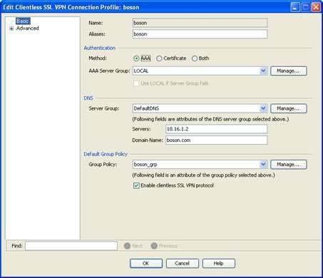 This pane displays a summary of the connection profiles that are configured on the Cisco Adaptive Security Appliance (ASA). In this scenario, there are three connection profiles. There are two default profiles, DefaultRAGroup and DefaultWEBVPNGroup, and one userspecified connection profile, boson. To view which group policy is associated with which connection profile, you should doubleclick the connection profiles to open the Edit Clientless SSL VPN Connection Profile dialog box. The default group policy that is associated with a connection profile is displayed on the Basic pane of this dialog box. By viewing this information, you can determine that only the boson connection profile uses the boson_grp group policy. The Basic pane of the boson connection profile is shown in the following exhibit: