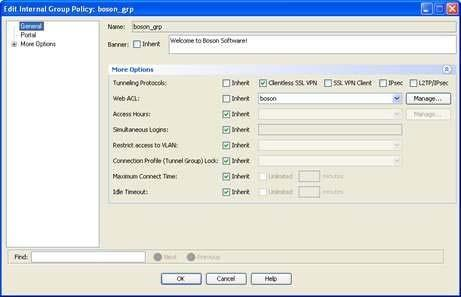 You can view the details of the boson_grp group policy to determine whether a banner message will be displayed to VPN clients. This information is displayed on the Generalpane of the Add or Edit Internal Group Policy dialog box. To view the details of an existing group policy for clientless SSL VPN users in ASDM, you should click Configuration, expand Clientless SSL VPN Access, and click Group Policies. You can then doubleclick boson_grp, which will open the Edit Internal Group Policy dialog box, which is shown in the following exhibit:
