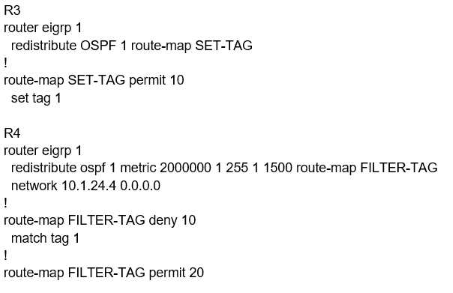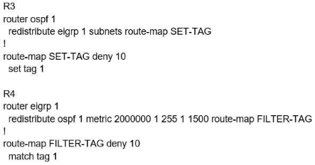 This is because in the redistribute OSPF statement, BW metric has a higher value and delay has a value of 1. So, R2 chooses R4 over R1 for 10.1.1.0/24 subnet causing a loop. Now, R5 learns 10.1.1.0/24 from R3 and advertises the same route to R4, that R4 redistributes back in EIGRP. If R3 sets a tag of 1 while redistributing EIGRP in OSPF, and R4 denies all the OSPF routes with tag 1 while redistributing, it will not advertise 10.1.1.0/24 back into EIGRP. Hence, the loop will be broken.
