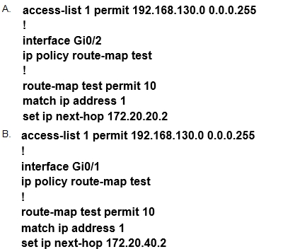 Which configuration configures a policy on R1 to forward any traffic that is sourced from the 192.168.130.0/24 network to R2?