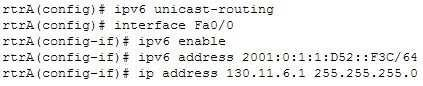 The correct answer is that IPv4 and IPv6 are running simultaneously on rtrA. The set of commands enables IPv6 on the rtrA router and assigns an IPv4 address and an IPv6 address to the Fa0/0 interface. This indicates that the router is a dual-stack router on which both IPv4 and IPv6 are running simultaneously.  The IPv4 address is not translated to the IPv6 address by the given set of commands because NAT-PT is not enabled on the router. To enable NAT-PT on a router, you need to use the ipv6 nat command. In addition, the ipv6 nat prefix command should be used to specify an IPv6 prefix.  The IPv6 address is not an IPv4-compatible address. IPv4-compatible IPv6 addresses are used in automatic IPv4-compatible IPv6 tunnels. These addresses refer to those IPv6 unicast addresses that have zeros in the first 96 bits and an IPv4 address in the last 32 bits. For example, 0:0:0:0:0:0:192.156.10.67 is an IPv4compatible IPv6 address where 192.156.10.67 is an IPv4 address. The IPv6 address (2001:0:1:1:D52::F3C/64), in this case, is not an IPv4-compatible IPv6 address.   A tunnel is not created for the interoperability of the IPv4 and IPv6 addresses because the given set of commands configures the router as a dual-stack router.  There are no commands for configuring a tunnel on the router.  Objective: Network  Principles Sub- Objective: Recognize proposed changes to the network  References: Cisco IOS IPv6 Configuration Guide, Release 12.4 > Implementing IPv6 Addressing and Basic Connectivity > Configuration Examples for Implementing IPv6  Addressing and Basic Connectivity > Example: Dual Protocol Stacks Configuration