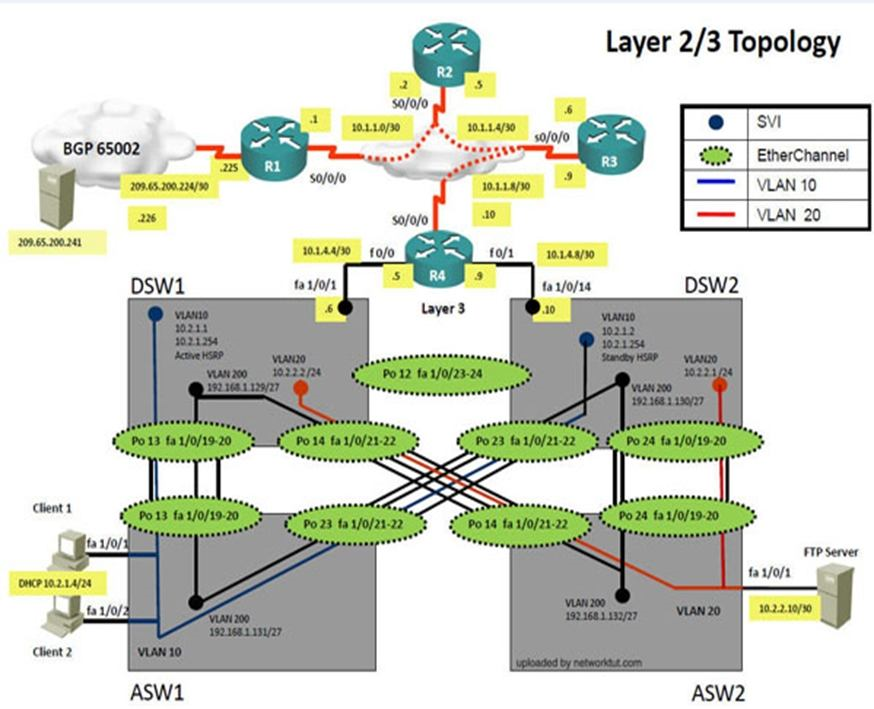 The implementation group has been using the test bed to do a ‘proof-of-concept’ that requires both Client 1 and Client 2 to access the WEB Server at 209.65.200.241. After several changes to the network addressing, routing scheme, DHCP services, NTP services, and FHRP services, a trouble ticket has been opened indicating that Client 1 cannot ping the 209.65.200.241 address.