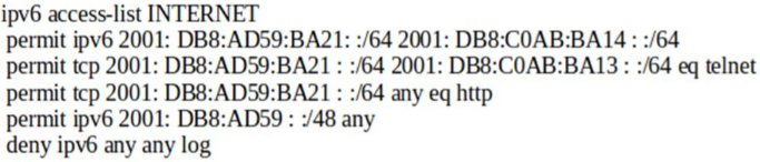 4. A packet with a source address of 2001:DB80:AD59:BA21:101:CAB:64:38 destined to port 80 will be permitted.