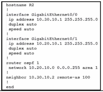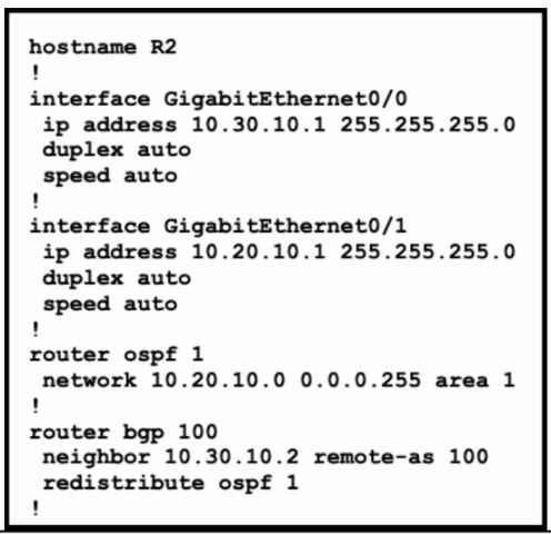 The commandredistribute ospf 1 match externalis missing on router R2. This command is needed to redistribute only the external OSPF routes into BGP. The external OSPF routes are those that are learned from another routing protocol or redistributed into OSPF. In this case, the 10.0.10.0/24 network is an external OSPF route, as it is redistributed from EIGRP into OSPF on router R1. The other commands are either already present or not relevant for this scenario.