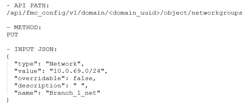 Which snippet is used to create an object for network 10.0.69.0/24 using Cisco Firepower Management Center REST APIs?