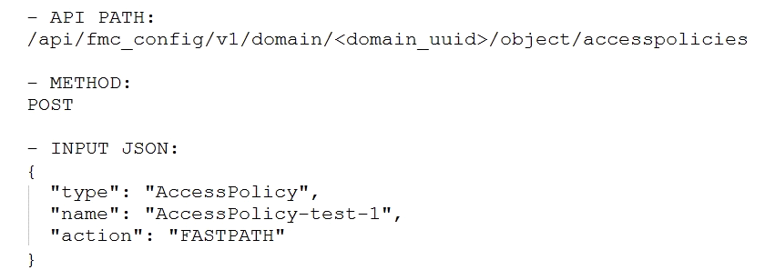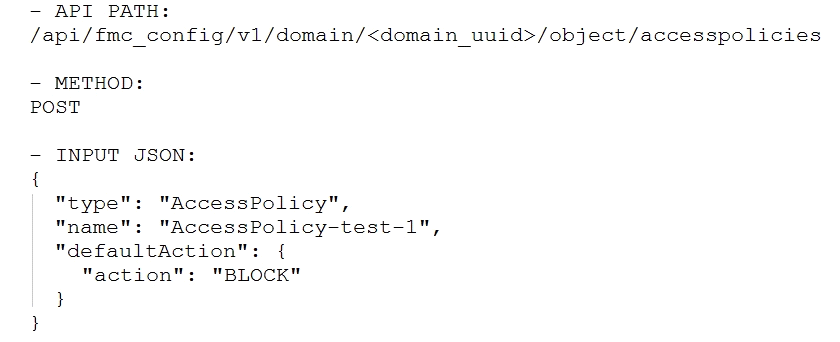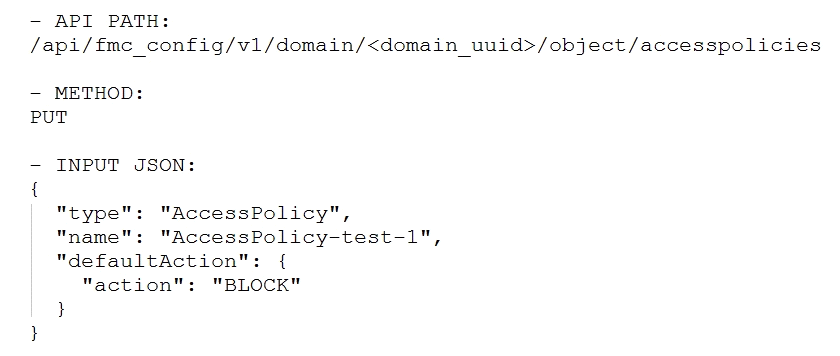 If the goal is to create an access policy with the default action of blocking traffic, using Cisco Firepower Management Center REST APIs, which snippet is used?