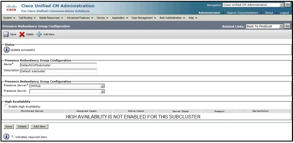 1. Add a new presence redundancy group and click Save.