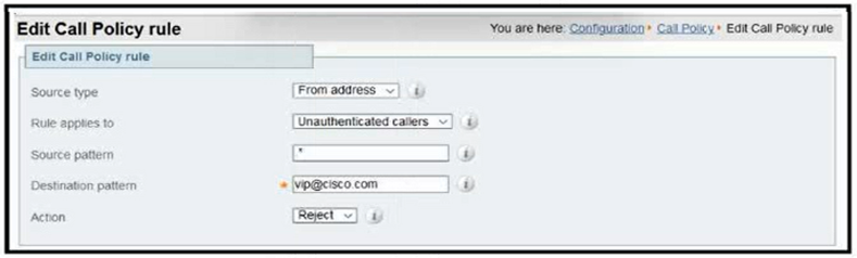 Refer to the exhibit. Call policy rules on an Expressway-E prevent external callers from the internet from calling a VIP whose URI is [email protected]. Which additional configuration setting is required for this call policy to function as intended?