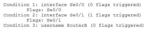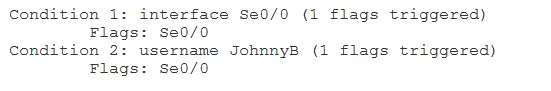 You do not need to issue the debug condition interface serial 0/0 command or the debug condition username JohnnyB command in this scenario. Both of these commands have already been issued, as you can determine by the output of the show debug condition command. Reissuing these command would cause the router to produce the % Condition already set message.