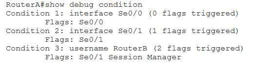 The debug condition {username username | called dialstring | callerdialstring} command enables you to limit the output of debugging messages by user name, calling party number, or called party number. Applying only one of those conditions to debugging output stops the output of debug messages on all interfaces. The router will then monitor each interface for a condition match. If a match occurs, debug messages will be displayed for that match. In this scenario, the debug condition username RouterB command will display output when an interface sends or receives a PPP authentication packet that contains the user name RouterB. However, because you have also issued the debug condition interface serial 0/0 command and the debug condition interface serial 0/1 command, PPP authentication messages that apply to either of those interfaces will be displayed even if the RouterB user name is not matched.