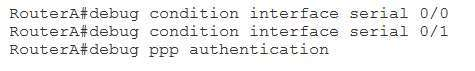 Configuring a series of debug condition interface interface commands limits debug message output to the series of specified interfaces. The debug output need match only one of the interface conditions to be displayed. For example, you could issue the following commands on RouterA to ensure that PPP authentication debug messages that apply to either the Serial 0/0 interface or the Serial 0/1 interface are displayed on the router: