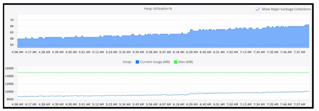 Refer to the exhibit. Using this heap utilization graph, which method is used to confirm if a memory leak is occurring during a certain time frame?