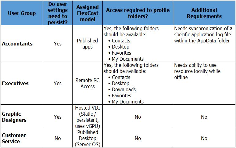 Scenario: A Citrix Architect is designing a new XenApp and XenDesktop environment and needs to determine which endpoints to include. Based on discussions with various departments, the user requirements listed in the Exhibit were collected.