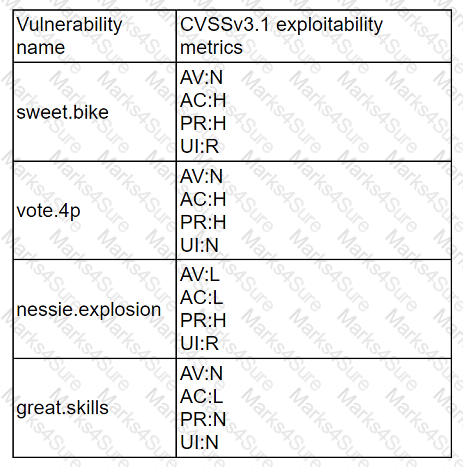 nessie.explosion should be prioritized for remediation, as it has the highest CVSSv3.1 exploitability score of 8.6. The exploitability score is a sub-score of the CVSSv3.1 base score, which reflects the ease and technical means by which the vulnerability can be exploited. The exploitability score is calculated based on four metrics: Attack Vector, Attack Complexity, Privileges Required, and User Interaction. The higher the exploitability score, the more likely and feasible the vulnerability is to be exploited by an attacker12. nessie.explosion has the highest exploitability score because it has the lowest values for all four metrics:Network (AV:N), Low (AC:L), None (PR:N), and None (UI:N). This means that the vulnerability can be exploited remotely over the network, without requiring any user interaction or privileges, and with low complexity. Therefore, nessie.explosion poses the greatest threat to the end user workstations, and should be remediated first. vote.4p, sweet.bike, and great.skills have lower exploitability scores because they have higher values for some of the metrics, such as Adjacent Network (AV:A), High (AC:H), Low (PR:L), or Required (UI:R). This means that the vulnerabilities are more difficult or less likely to be exploited, as they require physical proximity, user involvement, or some privileges34. References: CVSS v3.1 Specification Document - FIRST, NVD - CVSS v3 Calculator, CVSS v3.1 User Guide - FIRST, CVSS v3.1 Examples - FIRST
