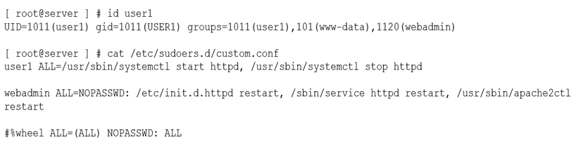 A Linux administrator provisioned a new web server with custom administrative permissions for certain users. The administrator receives a report that user1 is unable to restart the Apache web service on this server. The administrator reviews the following output: