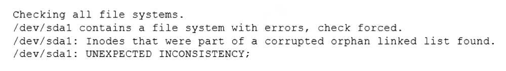 The command fsck.ext4 /dev/sda1 can be used to address the issue. The issue is caused by a corrupted filesystem on the /dev/sda1 partition. The error message shows that the filesystem type is ext4 and the superblock is invalid. The command fsck.ext4 is a tool for checking and repairing ext4 filesystems. The command will scan the partition for errors and attempt to fix them. This command can resolve the issue and allow the system to start.The other options are incorrect because they either do not fix the filesystem (partprobe or fdisk) or destroy the data on the partition (mkfs.ext4). Reference: CompTIA Linux+ (XK0-005) Certification Study Guide, Chapter 10: Managing Storage, page 325.