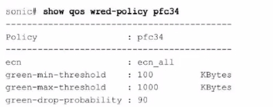 The output of the command show qos wred-policy pfc34 shows the ECN (Explicit Congestion Notification) configuration for the policy pfc34. The line ecn: ecn_all indicates that ECN is enabled for all traffic classes (all DSCP values). Additionally, the green-min-threshold, green-max-threshold, and green-drop-probability settings are shown, but there is no indication of a 10% probability for marking traffic as congested. Therefore, the correct answer is B.Dell Enterprise SONiC documentationDell Technologies InfoHub