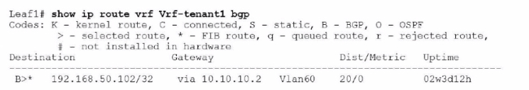 The exhibit shows a BGP EVPN route in a VXLAN environment. The route type can be determined based on the details provided. Type 2 routes in BGP EVPN are used to advertise MAC address reachability information between VTEPs (Virtual Tunnel End Points). The exhibit indicates a host route from another VTEP, which corresponds to a Type 2 route.Dell Technologies SONiC documentationBGP EVPN Configuration Guide