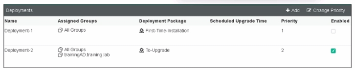 Deployment-2 has the 'To-Upgrade' package, is assigned to both 'All Groups' and 'trainingAD.training.lab,' with a priority of 2 and is enabled.