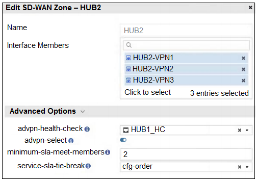 2. The configuration instructs FortiGate to allow ADVPN shortcuts for the tunnels of this SD-WAN zone.