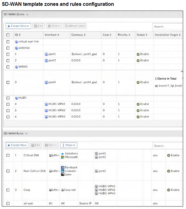 You used the HUB IPsec_Recommended and the BRANCH IPsec_Recommended templates to define the overlay topology. Then, you used the SD-WAN template to define the SD- WAN members, rules, and performance SLAs.