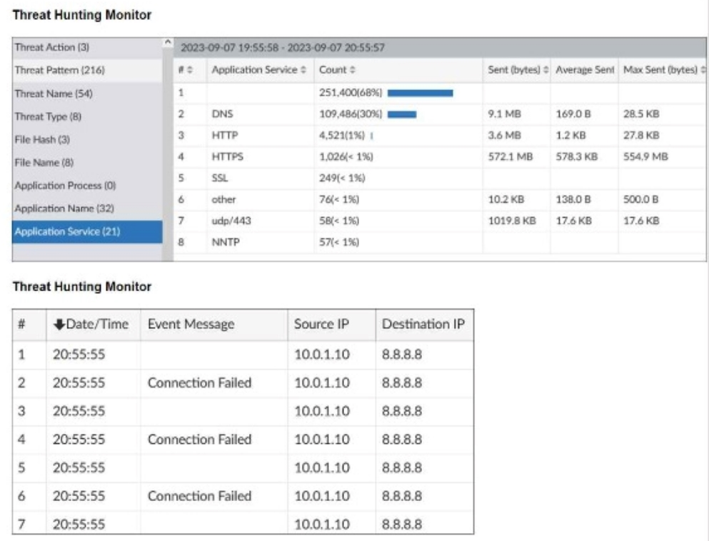 The Threat Hunting Monitor in the provided exhibits shows various application services, their usage counts, and data metrics such as sent bytes, average sent bytes, and maximum sent bytes.