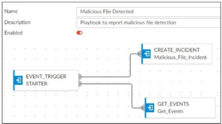 The exhibit shows a playbook in which an event trigger starts actions upon detecting a malicious file.