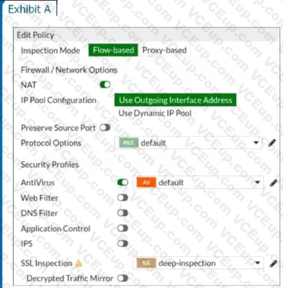 Refer to the exhibits to view the firewall policy (Exhibit A) and the antivirus profile (Exhibit B).