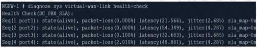 The exhibit contains the configuration for an SD-WAN Performance SLA, as well as the output of diagnose sys virtual-wan-link health-check.