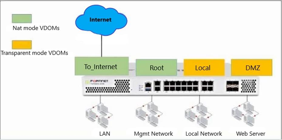 The Root and To_Internet VDOMs are configured in NAT mode. The DMZ and Local VDOMs are configured in transparent mode.