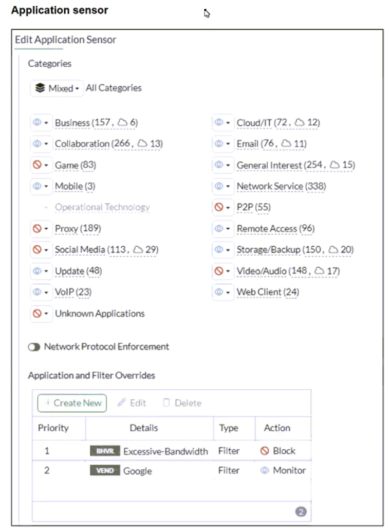 You have implemented the application sensor and the corresponding firewall policy as shown in the exhibits.