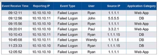 Grouping Criteria: For this question, events are grouped by 'User,' 'Source IP,' and 'Application Category.'