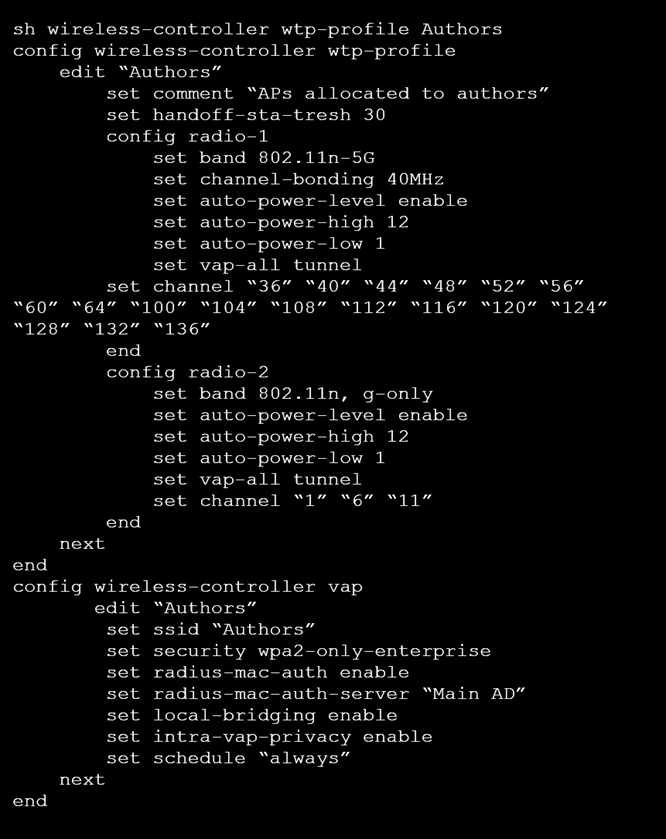 The configuration changes that will resolve the issue are to configure set vaps to be ''Authors'' for both interfaces in the wtp-profile, and to configure vap-all to be manual for both interfaces in the wtp-profile. This is because the current configuration does not assign any VAPs to the AP interfaces, which means that no wireless networks are broadcasted by the APs. The vap-all setting determines whether all VAPs are assigned to an interface or not, and the vaps setting specifies which VAPs are assigned to an interface. By setting vap-all to manual and vaps to ''Authors'', the APs will only broadcast the Authors wireless network on both interfaces. Disabling intra-vap-privacy for the Authors vap-wireless network will not help, as it only affects the communication between clients on the same SSID, not their connection to the AP. Increasing the transmission power of the AP radio interfaces will not help, as it only affects the signal strength and coverage of the APs, not their broadcasting of wireless networks.