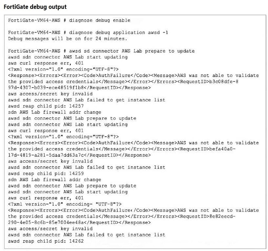 Invalid Credentials:The debug output shows an 'AuthFailure' error, indicating that AWS was not able to validate the provided access credentials. This usually points to incorrect or invalid AWS access or secret keys configured in the AWS Lab SDN connector (Option C).Clock Skew:Another common reason for authentication failures in AWS API calls is a clock skew between the FortiGate device and AWS. AWS requires that the system time of the client making the API call is synchronized with its own time, within a small margin. If there is a significant time difference, AWS will reject the credentials (Option B).Other Options Analysis:Option A is incorrect because the AWS API supports XML version 1.0.Option D is incorrect as the error message does not indicate an issue with connecting on port 401.Option E is incorrect because the error is related to authentication, not the absence of instances.AWS API Authentication: AWS API SecurityFortiGate AWS Integration Guide: FortiGate AWS Integration