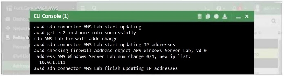 Dynamic Address Object Update:The debug output shows that the IP address of the AWS Windows Server Lab has been updated automatically, indicating that the dynamic address object feature is working as intended. This allows FortiGate to adapt to changes in the IP addresses of AWS instances dynamically (Option A).SDN Connector Configuration:The messages in the debug output confirm that the SDN connector is able to retrieve instance information and update the firewall address objects successfully. This implies that the SDN connector is correctly configured and has the necessary permissions (Option C).Manual Change and Permissions:Option B is incorrect because while the address object could theoretically be changed manually, this is not inferred from the debug output.Option D is incorrect because the debug output does not indicate that the AWS user account must have full administrative rights. The required permissions are typically more scoped to specific actions related to SDN.FortiGate AWS Integration Guide: FortiGate on AWSAWS IAM Policies for SDN: AWS IAM Policies