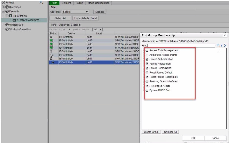 Which port group membership should you enable on FortiNAC to isolate rogue hosts'?