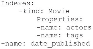 You are deploying a new storage system for your mobile application, which is a media streaming service. You decide the best fit is Google Cloud Datastore. You have entities with multiple properties, some of which can take on multiple values. For example, in the entity ‘Movie’ the property ‘actors’ and the property ‘tags’ have multiple values but the property ‘date released’ does not. A typical query would ask for all movies with actor=<actorname> ordered by date_released or all movies with tag=Comedy ordered by date_released. How should you avoid a combinatorial explosion in the number of indexes?