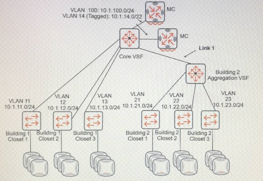 The customer needs to expand its wired and wireless network to a new building, Building 2, which is near the existing building, Building 1. The exhibit shows the logical plan that the architect has created so far. The aggregation layer switches in the new building should provide the default gateway services for the VLANs in the new building and route traffic to the core. The existing Aruba Mobility Controllers (MCs) will control the new APs.