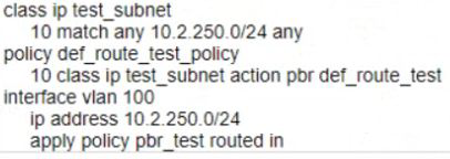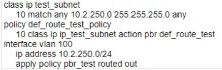 You are configuring Policy Based Routing (PBR) for a subnet that will be used to test a new default route for your network Traffic originating from 10.2.250.0/24 should use a new default route to 10.1.1.253. Other non-default routes for this subnet should not be affected by this change.