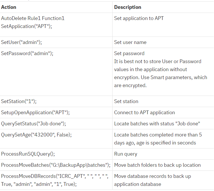 4. A new custom task pointing to 2 different rulesets using the Nenu library actions. 1 Ruleset to run the queries: QuerySetStatus(”Job done”) and QuerySetAge (“432000”, False); and another ruleset to run ProcessDeleteBatches.