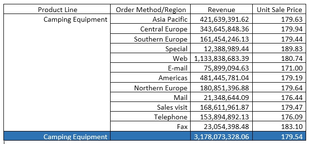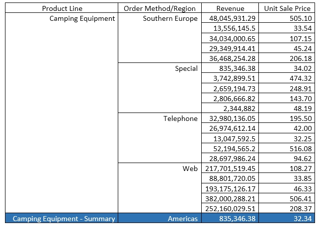 2. Set the detail aggregation property to None for product line and order method. Total for Revenue. Average for Unit Sale Price.