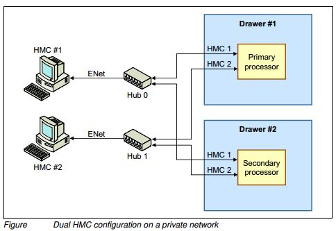 Using a redundant HMC configuration with your service processor setup requires a specific port configuration, as shown in the figure below.   The HMC’s first Ethernet port, eth0, should be configured to be a Dynamic Host Configuration Protocol (DHCP) server over a private network. References: IBM Power Systems HMC Implementation and Usage Guide (April 2013), page 43http://www.redbooks.ibm.com/redbooks/pdfs/sg247491.pdf