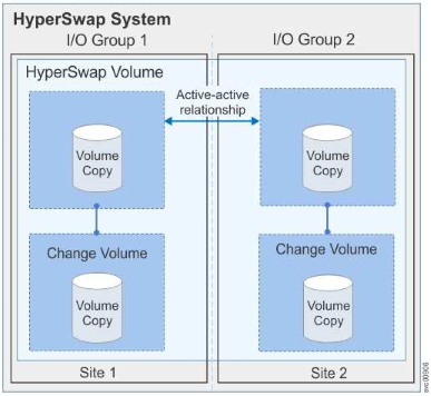 HyperSwap volumes, where copies of a single volume are in different storage pools that are on different sites. The volume is cached in two I/O groups that are on different sites. These volumes can only be created on Storwize V5030 systems when the system topology is HyperSwap.