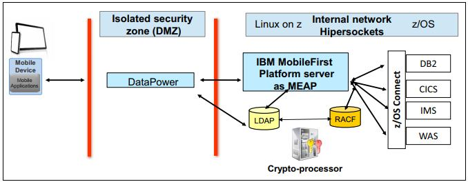 The capabilities of running heterogeneous environments on a System z platform and the IBM MobileFirst framework enable an organization to fully support a mobile strategy. The mobile environment, representing the System of Engagement, can integrate with existing back-end core transactional services and data on the System z platform, representing the Systems of Records. The products that are available within the MobileFirst framework can deliver the runtime environment, mobile device management, security, analytics, and development of the application and data platforms in a mobile environment on the System z platform. Figure: End-to-end security checkpoints  MEAP server is protected by a security gateway. The mobile client must authenticate and validate credentials upon encountering the gateway. Note: CICS stands for "Customer Information Control System." It is a general-purpose transaction processing subsystem for the z/OS operating system. CICS provides services for running an application online, by request, at the same time as many other users are submitting requests to run the same applications, using the same files and programs.References: http://www.redbooks.ibm.com/abstracts/tips1162.html?Open